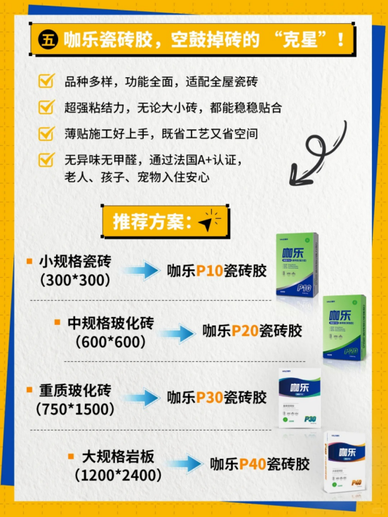 四、常见翻车补救方案! ✓空鼓砖:用吸盘取下,重涂胶补贴 ✓缝隙不均:局部敲碎重贴,美缝遮盖瑕疵 ✓瓷砖开裂:备同款砖,注胶修补或更换 五、咖乐瓷砖胶,空鼓掉砖的 “克星”! ✓品种多样,功能全面,适配全屋瓷砖 ✓超强粘结力,无论大小砖,都能稳稳贴合 ✓薄贴施工好上手,既省工艺又省空间 ✓无异味无甲醛,通过法国A+认证,老人、孩子、宠物入住安心 推荐方案: 小规格瓷砖(300*300)→咖乐P10瓷砖胶 中规格玻化砖(600*600)→咖乐P20瓷砖胶 重质玻化砖(750*1500)→咖乐P30瓷砖胶 大规格岩板(1200*2400)→咖乐P40瓷砖胶 跟着这份攻略走,贴砖牢固又美观!赶紧收藏起来,分享给正在装修的小伙伴吧~