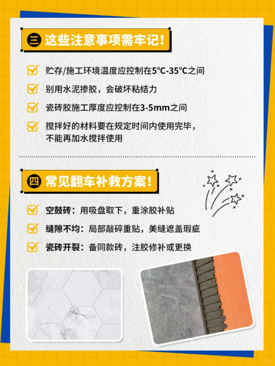三、这些注意事项需牢记! ✓贮存/施工环境温度应控制在5℃-35℃之间 ✓别用水泥掺胶,会破坏粘结力 ✓瓷砖胶施工厚度应控制在3-5mm之间 ✓搅拌好的材料要在规定时间内使用完毕,不能再加水搅拌使用