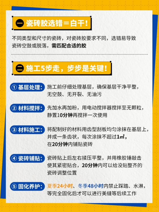 一、瓷砖胶选错=白干! 不同类型和尺寸的瓷砖,对瓷砖胶要求不同,选错易导致瓷砖空鼓或脱落,需匹配合适的胶